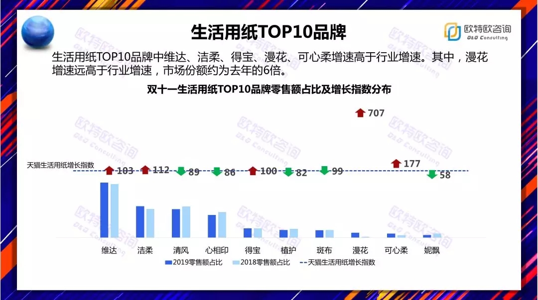雙11已成為中國消費市場的一個縮影,更是中國消費趨勢的風(fēng)向標(biāo)。生活用紙方面,維達、潔柔、清風(fēng)占據(jù)前三甲,在TOP10中,維達,潔柔、得寶、漫花、可心柔增速高于行業(yè)增速。那么下一個十年已經(jīng)開啟,誰將領(lǐng)跑中國消費市場呢?