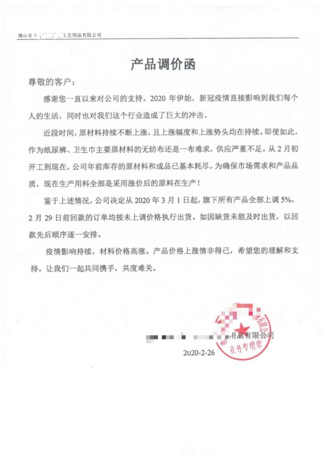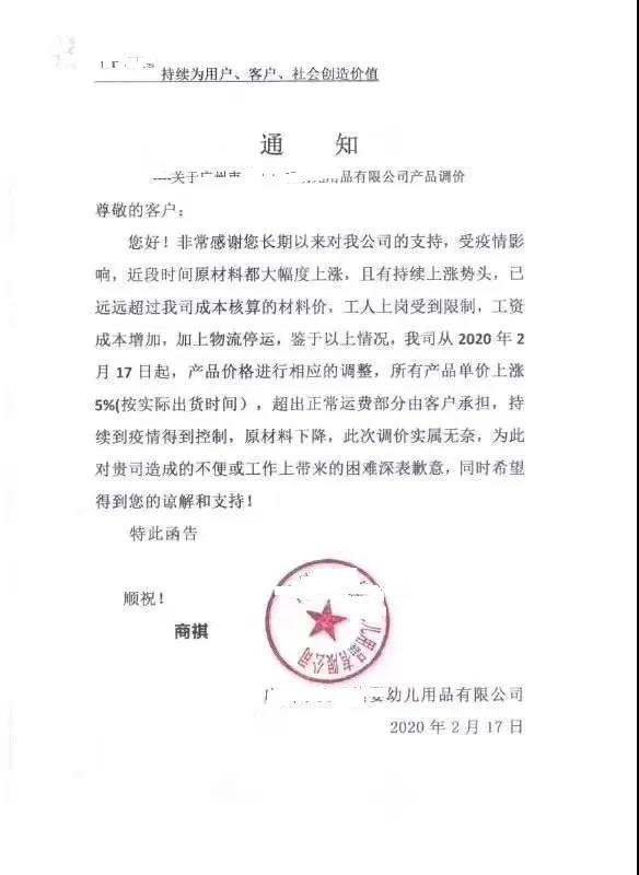“3月1日起,旗下所有產(chǎn)品上調(diào)5%”,“產(chǎn)品價(jià)格進(jìn)行相應(yīng)調(diào)整,原有的價(jià)格體系取消”。所有產(chǎn)品單價(jià)上漲5%,超出正常運(yùn)費(fèi)部分由客戶(hù)承擔(dān),持續(xù)到疫情得到控制,原材料下降”