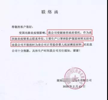 “受政委委托,作為此次疫情重點(diǎn)聯(lián)系單位,主要生產(chǎn)口罩和防護(hù)服原材料無(wú)紡布,不能按時(shí)正常提供嬰兒紙尿褲原材料”