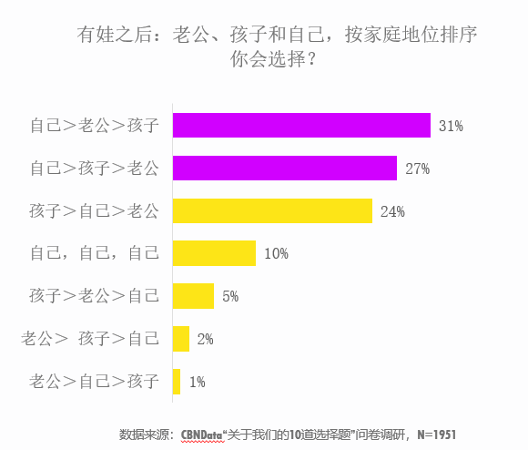 CBNData問卷調(diào)研數(shù)據(jù)顯示,近60%的婚后女性在“自己、老公、孩子”的地位排序中,選擇將自我放在第一位。