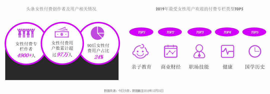 同時,越來越多的女性讀者開始愿意為優(yōu)質(zhì)內(nèi)容買單。以今日頭條為例,截至2019年底,全年平臺女性付費專欄作者近5000人,女性付費用戶有近百萬,其中90后占24%。在所有的付費專欄里,親子教育、商業(yè)財經(jīng)和職場技能類專欄最受女性用戶喜歡。