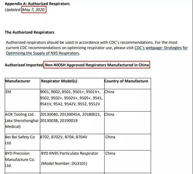 5月7日,美國FDA更新了針對中國生產(chǎn)的未獲NIOSH認證的口罩獲得EUA授權的文件,獲得FDA認可的中國生產(chǎn)的非NIOSH認證的口罩只剩下14個廠家。