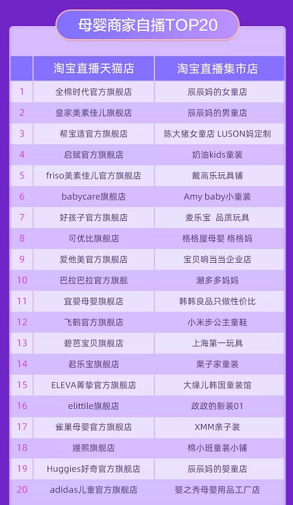 在母嬰領域,各品牌也在大力布局直播,據(jù)淘寶公開數(shù)據(jù),6月1日~6月18日母嬰商家自播TOP榜,幫寶適、babycare、好孩子、可優(yōu)比、愛他美、巴拉巴拉、好奇、Adidas等品牌的天貓官方旗艦店紛紛登榜。上榜母嬰親子TOP榜的品牌,在直播上也同樣表現(xiàn)優(yōu)秀。此次618大戰(zhàn)中,直播功不可沒,已經(jīng)成為商家業(yè)績增長一大新動力。