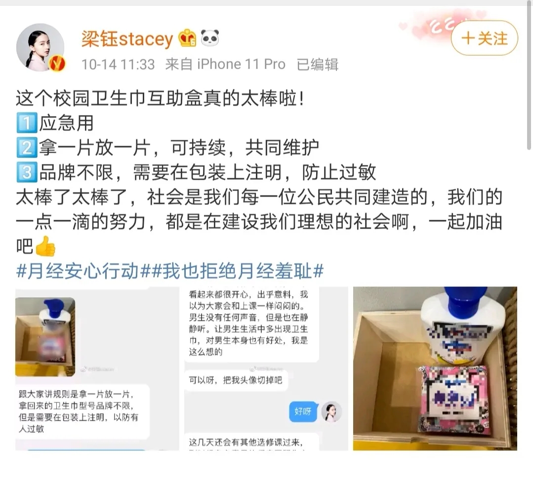 2020年10月14日,博主@梁鈺stacey在微博分享了一位中學(xué)女教師給她的留言,該名女教師在教室里做了衛(wèi)生巾互助盒,方便忘帶衛(wèi)生巾的女生使用。