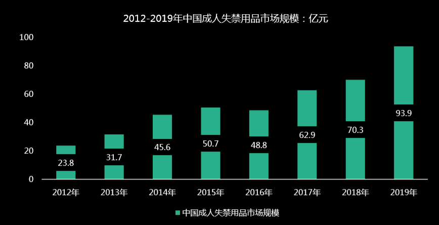 根據(jù)人口失禁發(fā)生率和人口結(jié)構(gòu)估算,中國失禁的人數(shù)在2-3億人,按照每人正常使用片單數(shù)去核算,這個群體的失禁用品規(guī)模應該是現(xiàn)在實際的4-5倍(2019年中國成人失禁用品市場規(guī)模為93.9億元),這還是保守估算的結(jié)果。