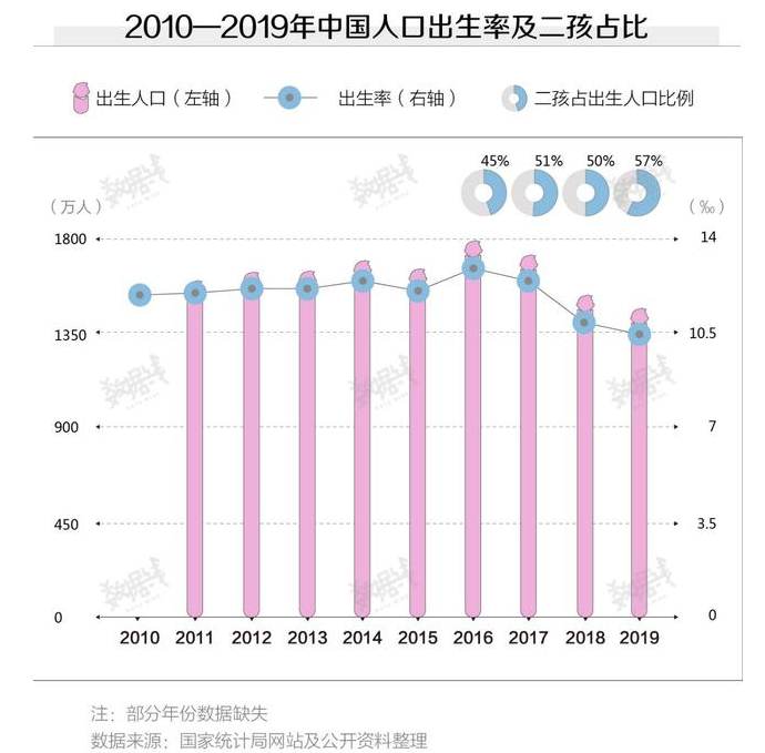2017年,我國出生人口數(shù)量達到1723萬人,其中二孩占比達到51%,首次超過一孩。截至2019年,二孩數(shù)量已經(jīng)連續(xù)三年占據(jù)出生人口數(shù)量的一半以上。.png)