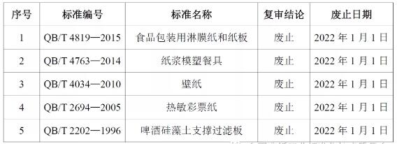工業(yè)和信息化部2020年12月31日發(fā)布公告(中華人民共和國工業(yè)和信息化部公告2020年第51號),公告了一批行業(yè)標準的復(fù)審結(jié)論。其中,QB/T 4819—2015《食品包裝用淋膜紙和紙板》等五項造紙行業(yè)標準予以廢止,廢止日期均為2022年1月1日。具體情況如下: