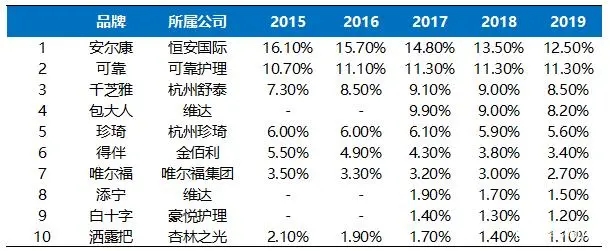在企業(yè)數(shù)量上,2018年統(tǒng)計(jì)在冊的成人失禁用品生產(chǎn)企業(yè)有448家。本土廠商包括杭州可靠、恒安國際、豪悅護(hù)理等,外資廠商包括金佰利、尤妮佳等。目前成人失禁用品以國內(nèi)品牌為主,2019年國內(nèi)品牌恒安國際安爾康、杭州可靠、杭州舒泰千芝雅市占率分別為12.5%、11.3%、8.5%,占據(jù)前三。