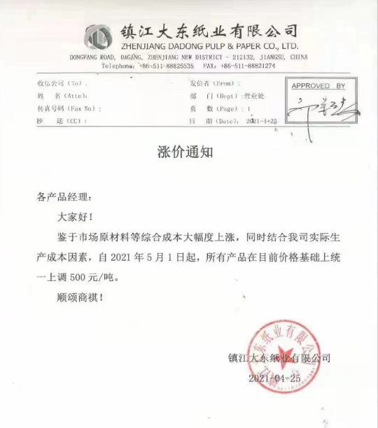 大東紙業(yè):5月1日起,所有產(chǎn)品在目前價(jià)格基礎(chǔ)上統(tǒng)一上調(diào)500元/噸。