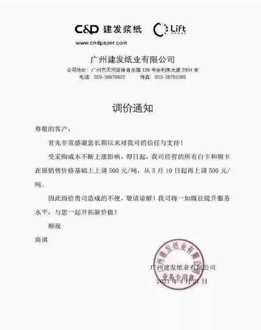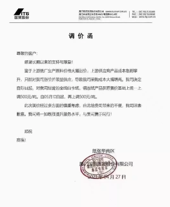 廈門國貿(mào)紙張華南區(qū):即日起,對我司經(jīng)營的全線白卡紙、銅版紙產(chǎn)品在原售價(jià)基礎(chǔ)上統(tǒng)一上調(diào)500元/噸。自5月10日起,再上調(diào)500元/噸。