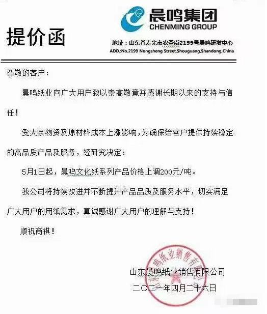 晨鳴紙業(yè):5月1日起,晨鳴文化紙系列產(chǎn)品價(jià)格上調(diào)200元/噸。
