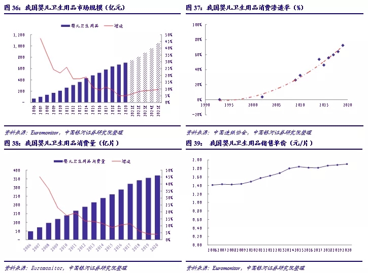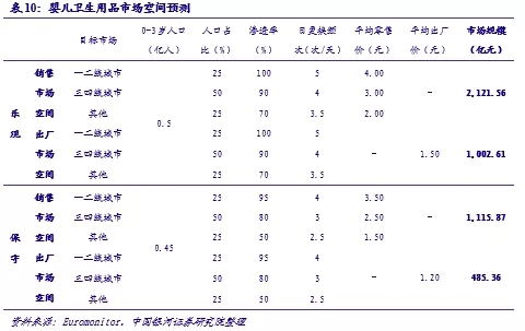 考慮到滲透率、日均使用量以及產(chǎn)品價(jià)格帶多種因素的差異,我們同樣按照不同地區(qū)劃分對(duì)嬰兒衛(wèi)生用品市場(chǎng)規(guī)模進(jìn)行了預(yù)測(cè)。其中因?yàn)?-3歲區(qū)間內(nèi)不同年齡段嬰兒的日均更換頻次不同,預(yù)測(cè)中進(jìn)行了取均數(shù)處理,通常新生兒每日應(yīng)該更換6-8次,隨著年齡的增長(zhǎng)時(shí)間間隔可以逐步拉長(zhǎng)。綜上,我們樂(lè)觀預(yù)期我國(guó)嬰兒衛(wèi)生用品的終端市場(chǎng)規(guī)模約2100億元,保守也可達(dá)到1100億元,較20年市場(chǎng)規(guī)模有60%-200%的提升空間;出廠價(jià)按照樂(lè)觀1.50元/片、保守1.20元/片的行情預(yù)測(cè),出廠市場(chǎng)規(guī)模也可達(dá)到490-1000億元。