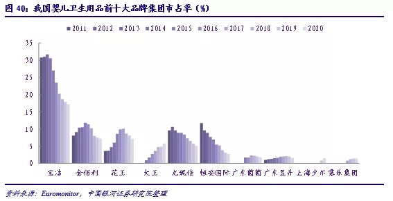 整體來(lái)看,我國(guó)嬰兒紙尿褲頭部公司份額波動(dòng)較大,行業(yè)尚未形成穩(wěn)定市場(chǎng)格局。近五年頭部公司市占率整體下滑,行業(yè)集中度不斷下滑,新興國(guó)產(chǎn)品牌迅速崛起,與國(guó)際品牌的差距收窄。