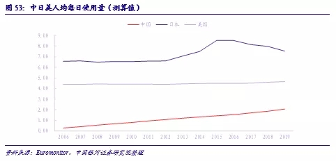 3.人均使用量的提升。伴隨著衛(wèi)生意識(shí)的提高,消費(fèi)升級(jí)趨勢(shì)以及嬰兒衛(wèi)生用品新產(chǎn)品的更新?lián)Q代,家長(zhǎng)們會(huì)更加注重紙尿褲安全性與舒適感,不斷提高使用更換頻次。根據(jù)測(cè)算,日本市場(chǎng)出現(xiàn)波動(dòng)前每個(gè)適齡嬰幼兒(0-3歲)的每日使用量約為6.5片,美國(guó)市場(chǎng)的長(zhǎng)期均值水平為4.5片/日;對(duì)比之下,盡管出現(xiàn)提升趨勢(shì),我國(guó)當(dāng)前的人均使用量為2片/日,較發(fā)達(dá)成熟市場(chǎng)存在較大差距,未來(lái)有望進(jìn)一步提升至4-6片/日的區(qū)間內(nèi)。