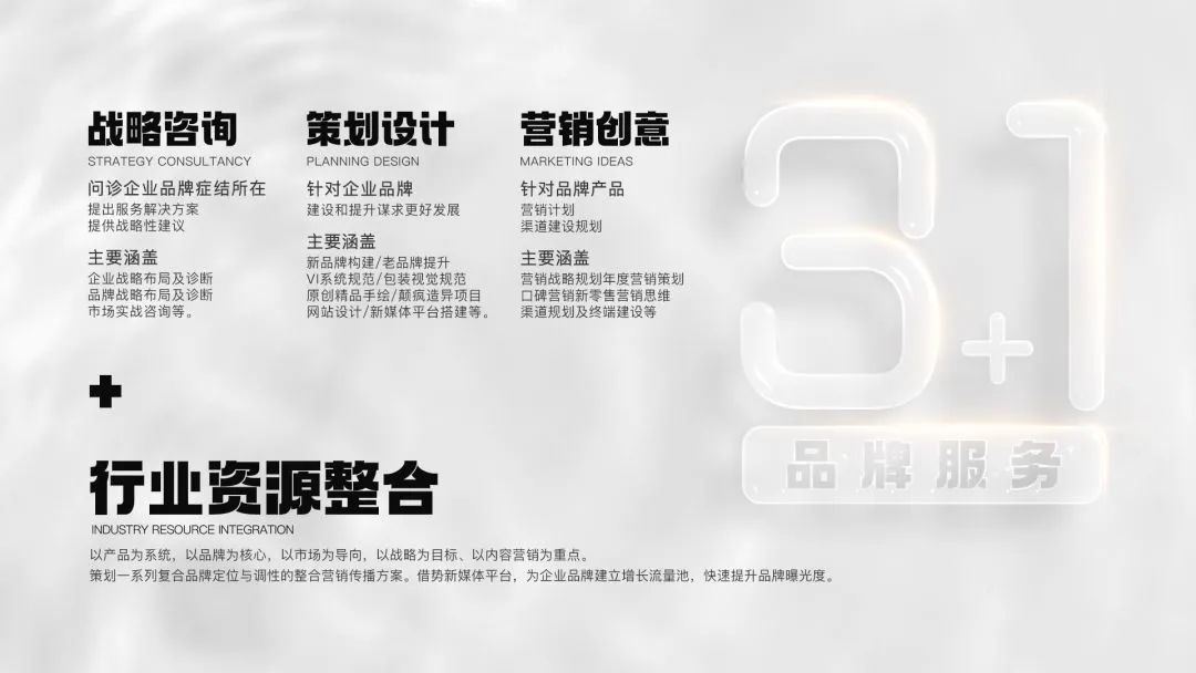 在一方品牌營銷管理堅持以品牌思維引領生活快消品行業(yè),致力于讓每個品牌更有價值,讓每個項目落到實處。“3+1品牌服務理念”精心打造戰(zhàn)略咨詢、策劃設計及營銷創(chuàng)意三大核心板塊,加之整合行業(yè)產(chǎn)業(yè)鏈,以提供定制型全案服務,驅(qū)動品牌的市場價值,締造行業(yè)第一綜合型服務品牌!