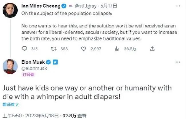 據(jù)財(cái)聯(lián)社報(bào)道,馬斯克近兩年頻繁就全球人口減少的問題多次發(fā)出警告,日前他又再度“催生”。馬斯克在一則推文中強(qiáng)調(diào)在出生率下降的情況下迫切需要采取行動(dòng),以及若不作為,人類未來所面臨的潛在后果。#馬斯克再敲人口警鐘#