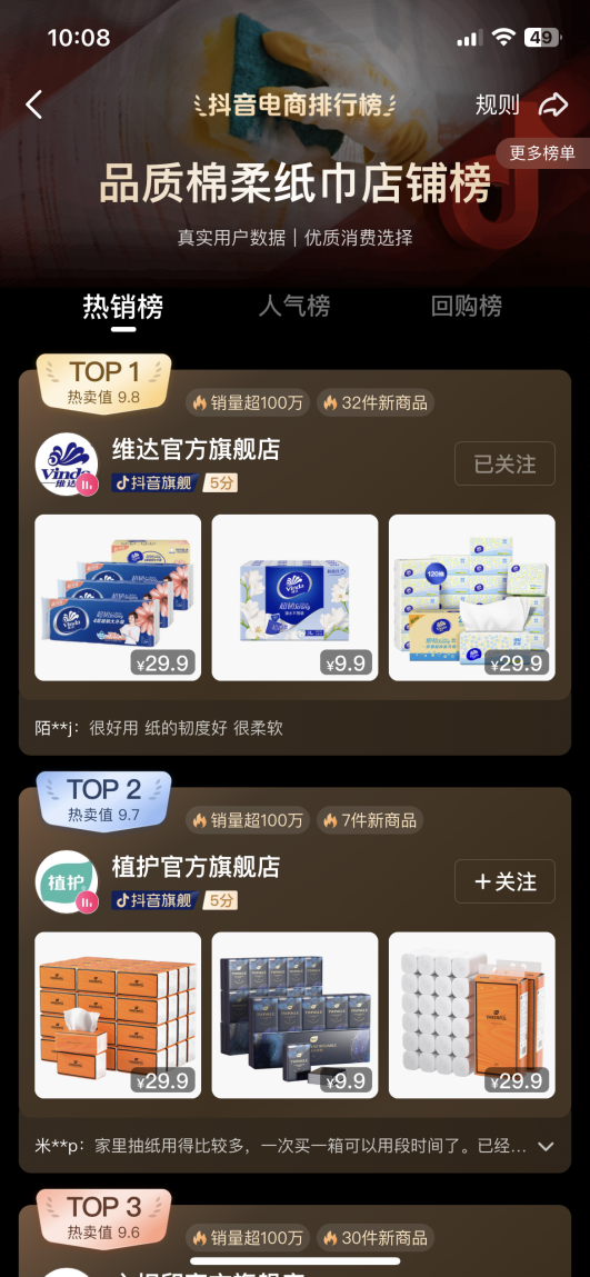 以生活用紙品牌維達(dá)為例,截至2023年7月25日,據(jù)抖音平臺(tái)直播動(dòng)態(tài)顯示,維達(dá)官方旗艦店今年上半年累計(jì)直播場次已超過200場。從最新的抖音電商排行榜來看,維達(dá)官方旗艦店已經(jīng)在“品質(zhì)綿柔紙巾店鋪熱銷榜”上排名第一。而店內(nèi)居銷量榜首的爆品手帕紙更是售出達(dá)到253.6萬件。其中排名前五的品類分別為手帕紙、卷芯紙和抽紙,手帕紙獨(dú)占前三名。