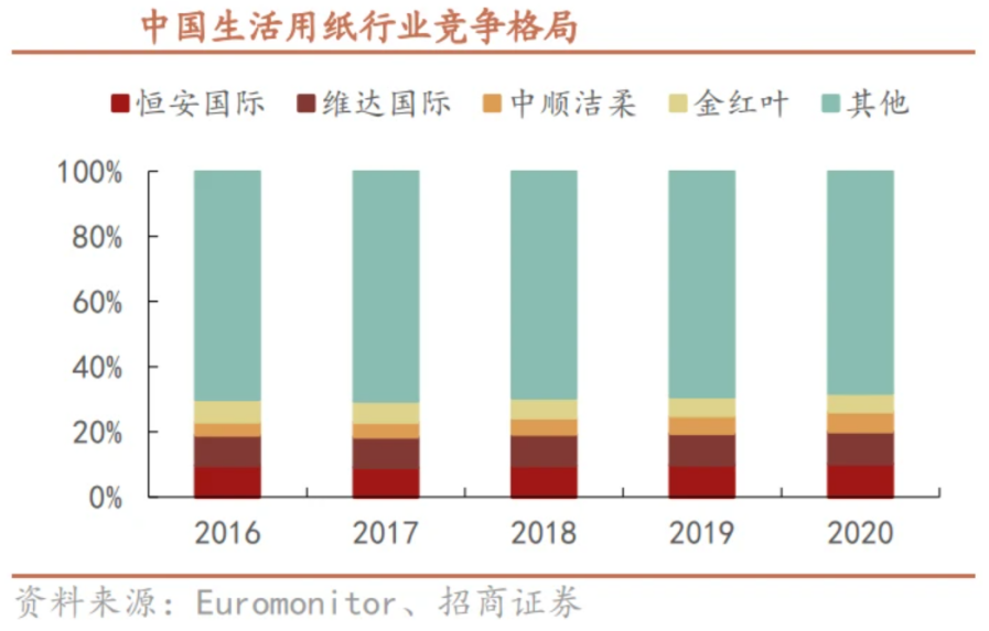 據(jù)招商證券研報(bào)顯示,2020 年中國生活用紙行業(yè)四巨頭恒安國際、維達(dá)國際、中順潔柔、金紅葉的市場占有率分別為 10.2%、10.0%、6.0%、5.7%,但行業(yè) CR4 僅為 31.9%,集中度仍有提升空間。那么,占據(jù)頭部一席的維達(dá)國際在提升市場份額上還能做些什么?