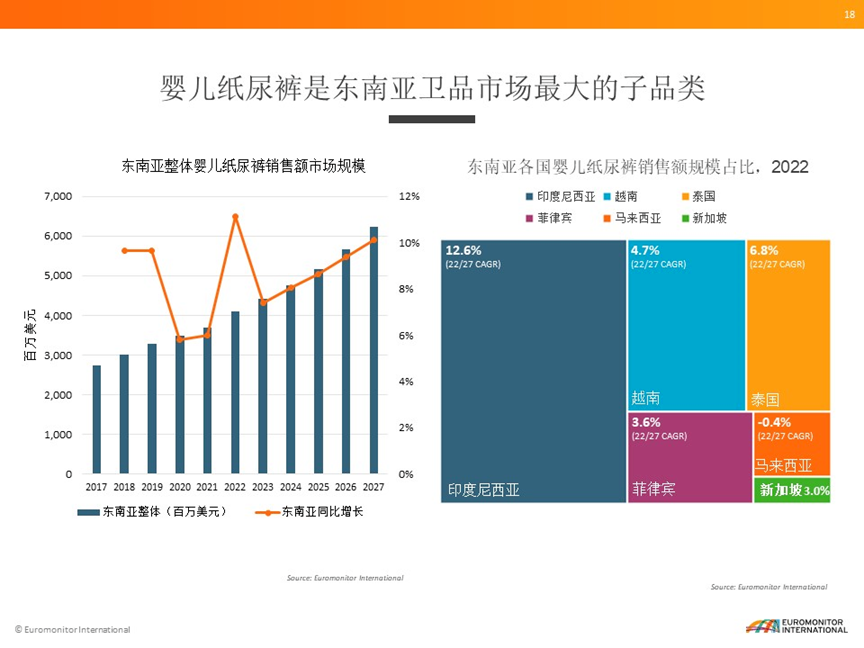 眾多紙尿褲品牌對東南亞市場情有獨鐘背后,是可觀的市場前景。根據(jù)Euromonitor(歐睿信息咨詢)數(shù)據(jù)顯示,2022年東南亞一次性衛(wèi)品市場整體零售額達(dá)到了65億美元,其中嬰兒紙尿褲是東南亞衛(wèi)品市場最大的子品類,去年市場規(guī)模超過了40億美元,21-22年同比增長達(dá)到將近11%。預(yù)計2027年嬰兒紙尿褲市場會超過60億美元。