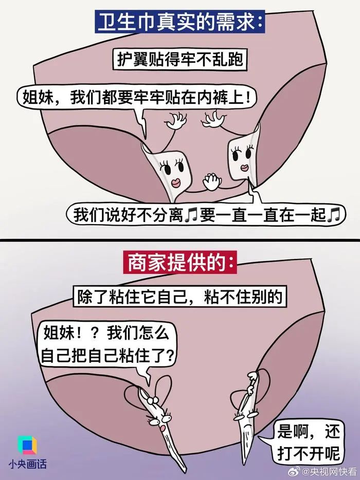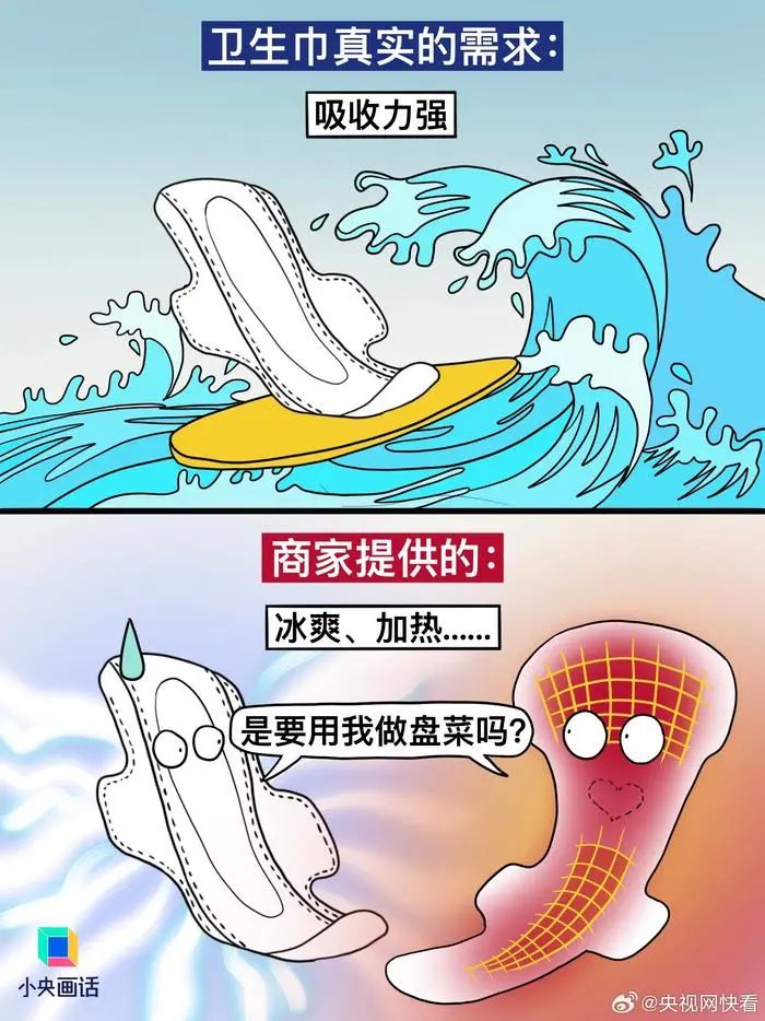 【#別拿消費(fèi)主義那套來(lái)做衛(wèi)生巾#】想不通,衛(wèi)生巾這種每個(gè)月都要用的東西,怎么會(huì)做得又貴又難用。商家以為我需要:加冰、加熱、加玻尿酸、粉嫩包裝、明星代言……實(shí)際我需要的:干凈衛(wèi)生、護(hù)翼好貼、安全不漏、價(jià)格適中。衛(wèi)生巾是日用品,別搞消費(fèi)主義輕奢那一套。(繪圖.阿彬的漫畫(huà)生活)#有種女性貧困叫月經(jīng)貧困#