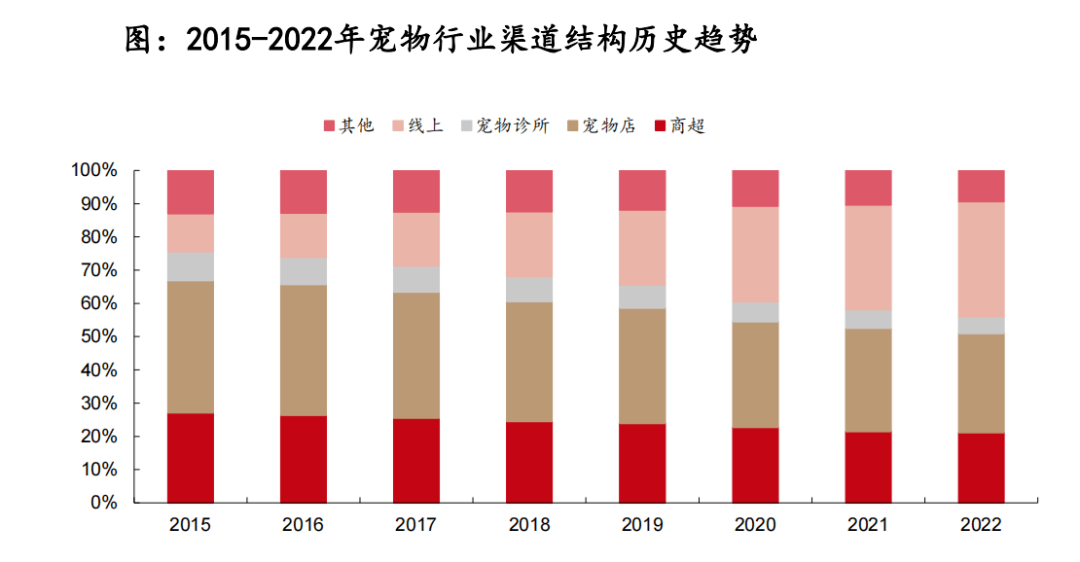 從渠道端來(lái)看,隨著電商平臺(tái)的高速發(fā)展,寵物用品銷(xiāo)售渠道線(xiàn)上化強(qiáng)勢(shì)。寵物用具銷(xiāo)售渠道豐富,線(xiàn)下銷(xiāo)售渠道可細(xì)分為商超、寵物店、寵物醫(yī)院診所等渠道,