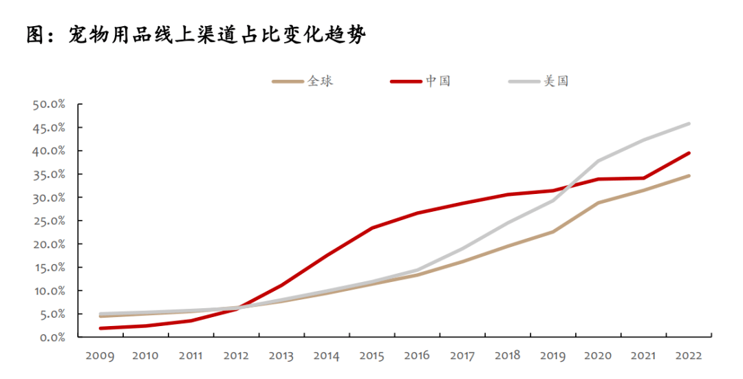 隨著電商平臺(tái)的迅猛發(fā)展以及線(xiàn)上購(gòu)物的便捷性,寵物用品線(xiàn)下銷(xiāo)售渠道占比有所下降,而線(xiàn)上渠道占比持續(xù)提升。根據(jù)歐睿國(guó)際的數(shù)據(jù)顯示,全球?qū)櫸镉闷肪€(xiàn)上渠道占比由2013年的7.7%增長(zhǎng)至2022年的34.6%,13-22年規(guī)模CAGR高達(dá)18.17%。
