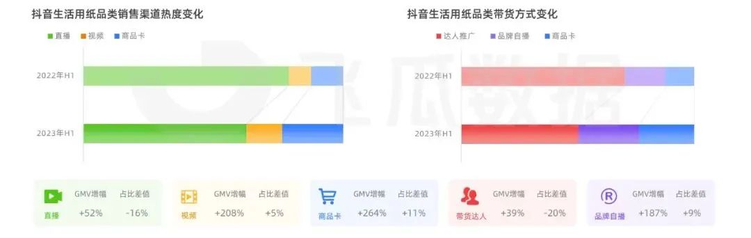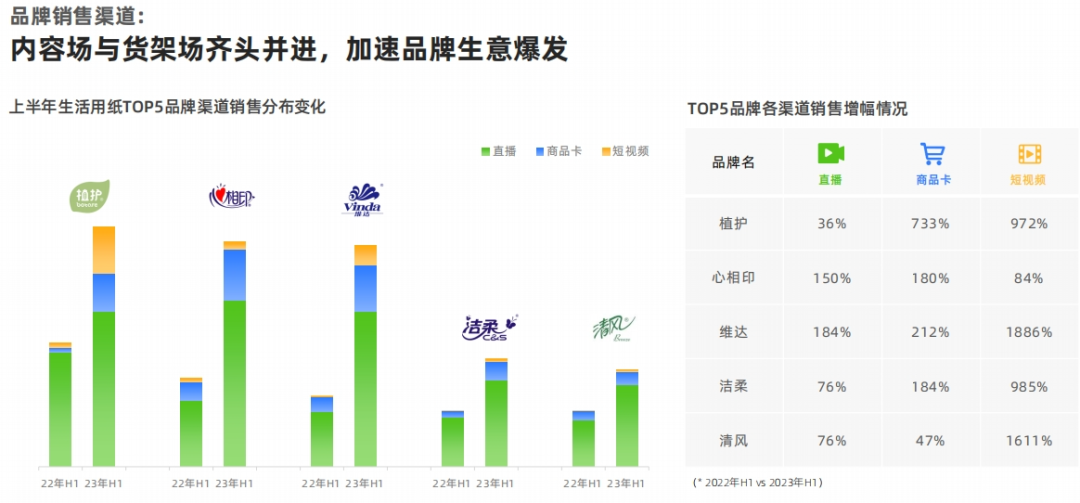 根據(jù)去年生活用紙TOP5品牌渠道銷售增幅變化數(shù)據(jù)顯示,相較于其他渠道方式,直播帶貨銷售額總體上較22年增長額最大,最高可達至184%,內(nèi)容場與貨架場齊頭并進,加速品牌生意爆發(fā)。