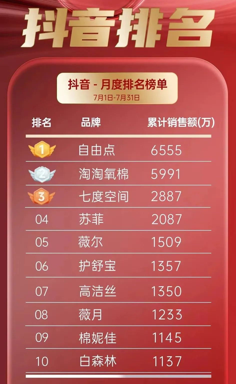 根據(jù)第三方數(shù)據(jù)平臺(tái)顯示,抖音平臺(tái)2024年7月份衛(wèi)生巾前十銷售榜單,其中,“自由點(diǎn)”品牌以6555萬(wàn)元的銷售額高居榜首,展現(xiàn)出了強(qiáng)大的市場(chǎng)號(hào)召力和消費(fèi)者認(rèn)可度。