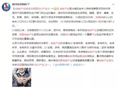 隨著中國老齡化進(jìn)程的加快,產(chǎn)業(yè)發(fā)展的機(jī)遇也逐漸到來。近日,#老齡產(chǎn)業(yè)將成為我國動(dòng)力產(chǎn)業(yè)之一#引發(fā)網(wǎng)民熱議~